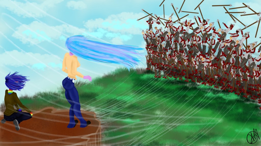 Once the phalanx began to march forward, Liren raised her hand in a gentle motion, and the wind’s velocity increased significantly around them. Then, using her powers to manipulate the air around her, she started to flick the soldiers away, one by one. They would fly into the air quickly, then slow and float. Liren had no intention of harming a single soldier. One by one the men would scream as Liren would knock them several feet into the air. Growing impatient after the first row, Liren knocked the next set by row, repeating this eleven times.